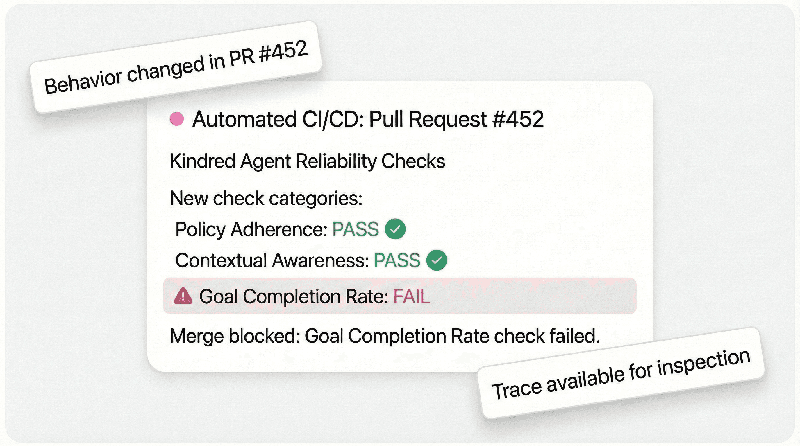 Kindred gives your team the tools to simulate failures, audit behavior, and approve agents for release.